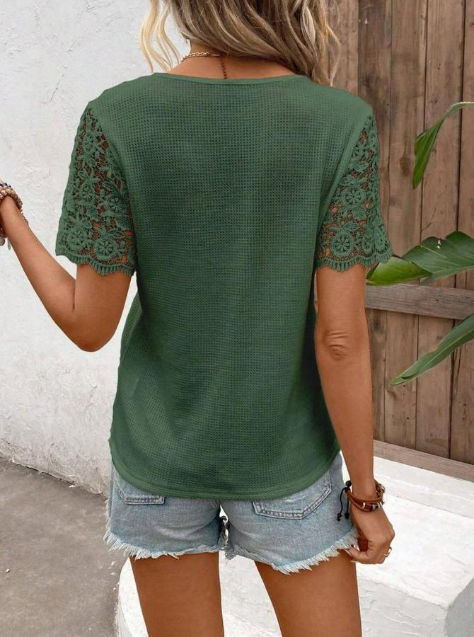 Kısa Kollu V Yakalı Önden Düğmeli Dantel Detaylı Waffle Bluz