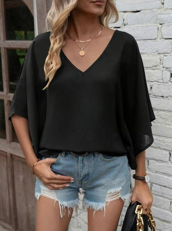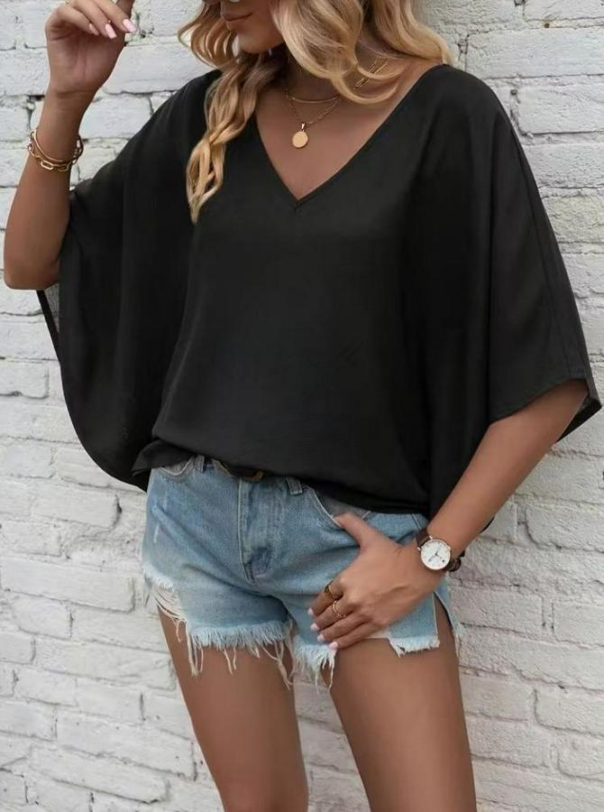 AnasayfaTüm ÜrünlerÜst GiyimBluz & TunikBluzKısa Kollu V Yakalı Salaş Viskon Bluz