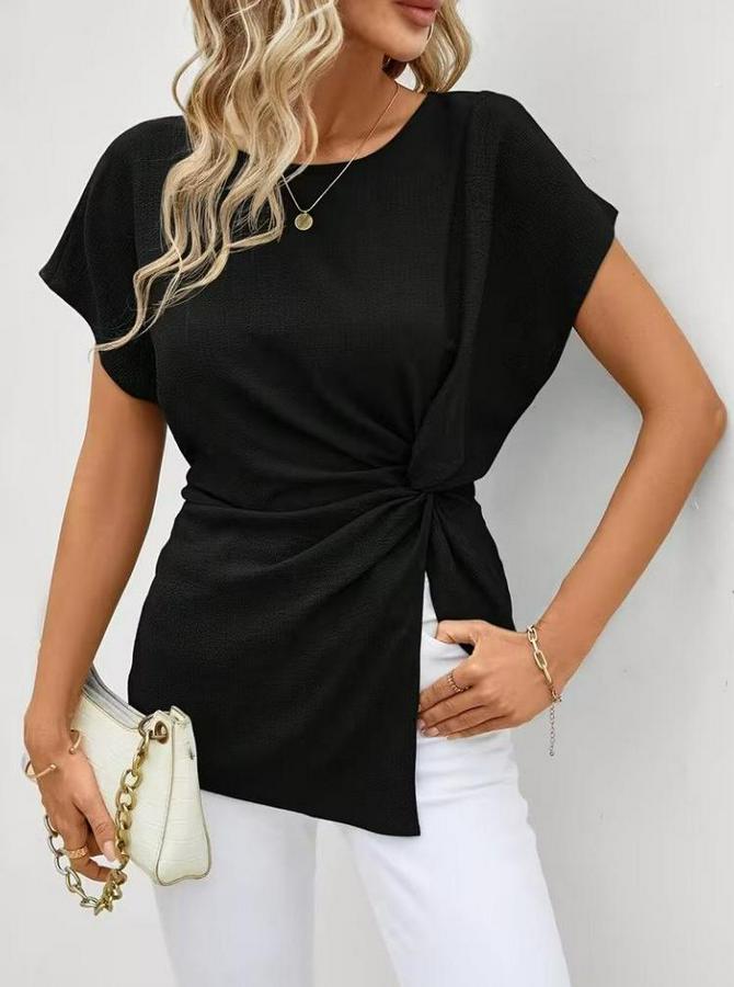 Kadın Kısa Kollu Yuvarlak Yakalı Yandan Sarmal Detaylı Bürümcük Bluz