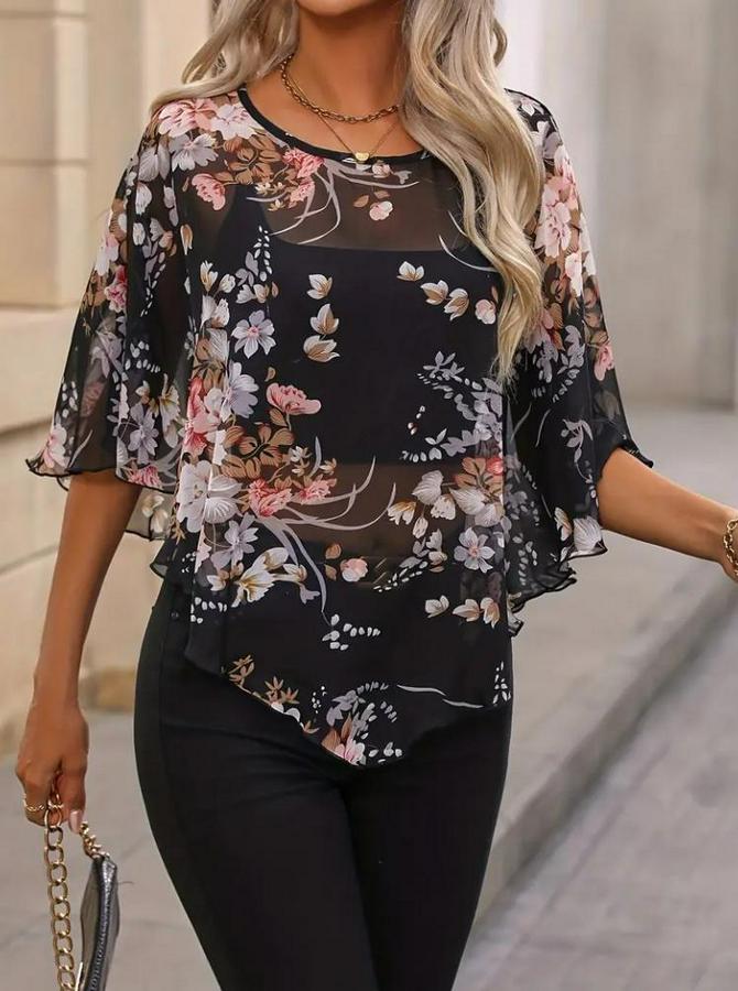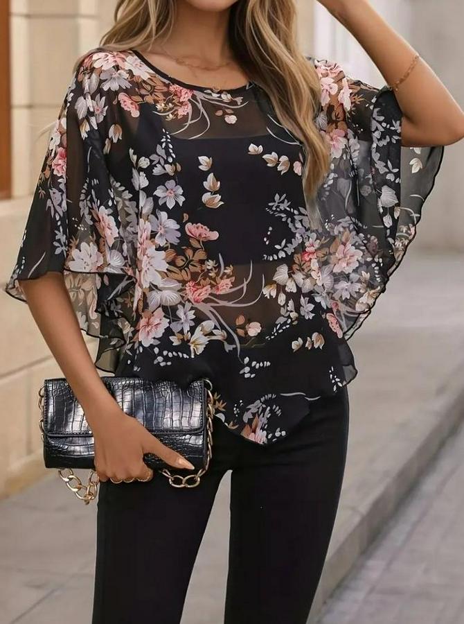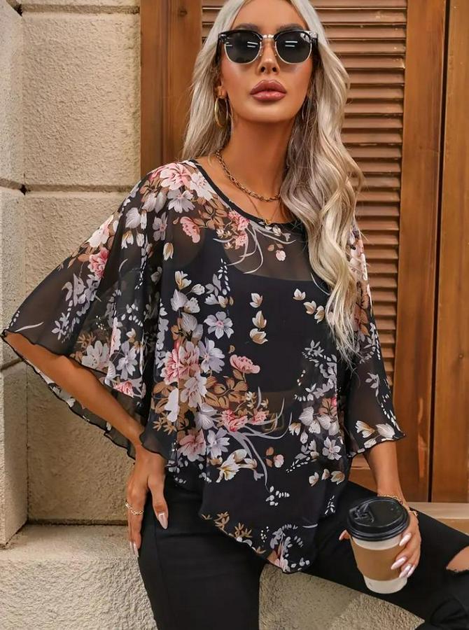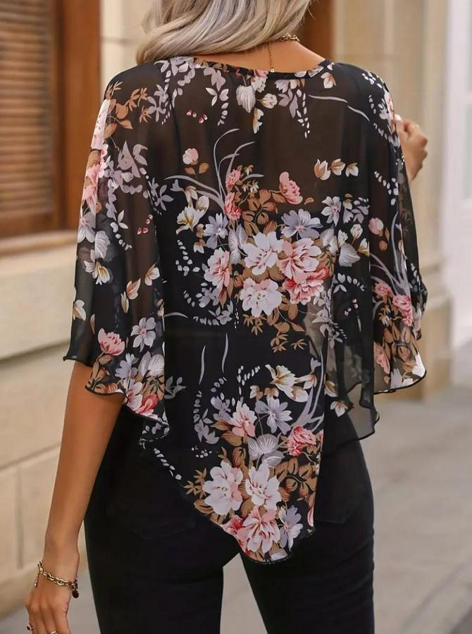 AnasayfaTüm ÜrünlerÜst GiyimBluz & TunikBluzKısa Yarasa Kollu Yuvarlak Yaka Çiçek Baskılı Asimetrik Kesim Özel Tasarım Şifon Bluz