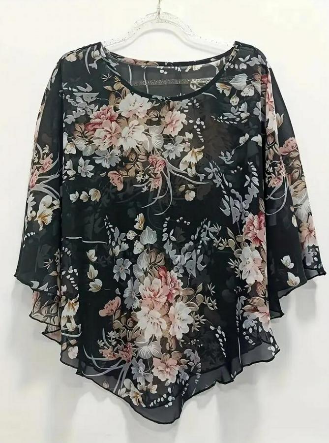 Kısa Yarasa Kollu Yuvarlak Yaka Çiçek Baskılı Asimetrik Kesim Özel Tasarım Şifon Bluz
