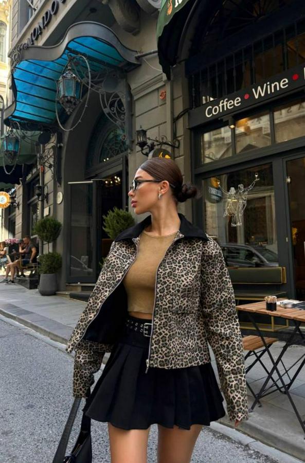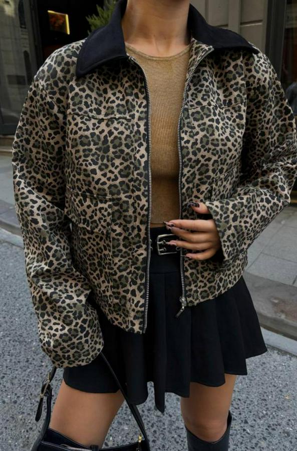 AnasayfaTüm ÜrünlerÜst GiyimBluz & TunikBluzLeopar Desen Crop Ceket Gabardin