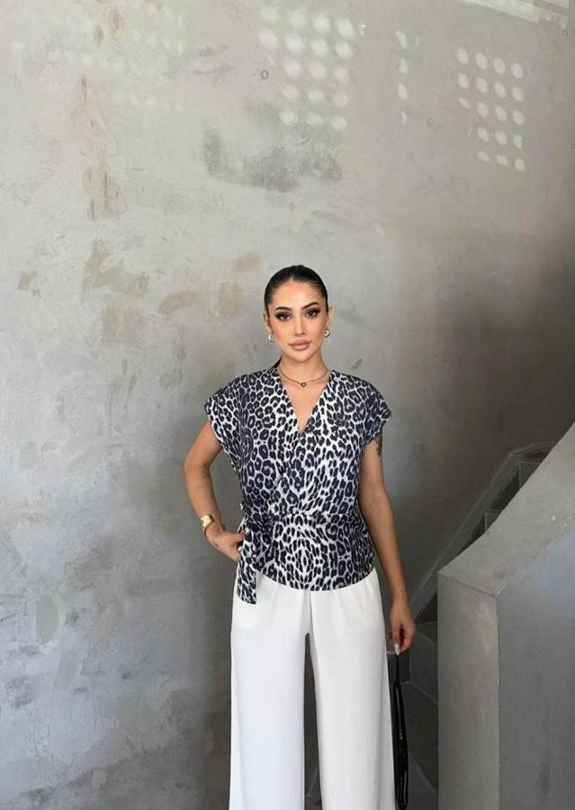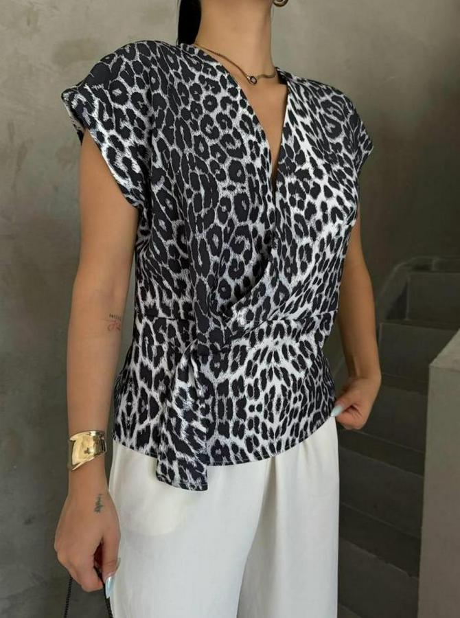 Leopar Desen Yandan Bağlama Detayli Bluz