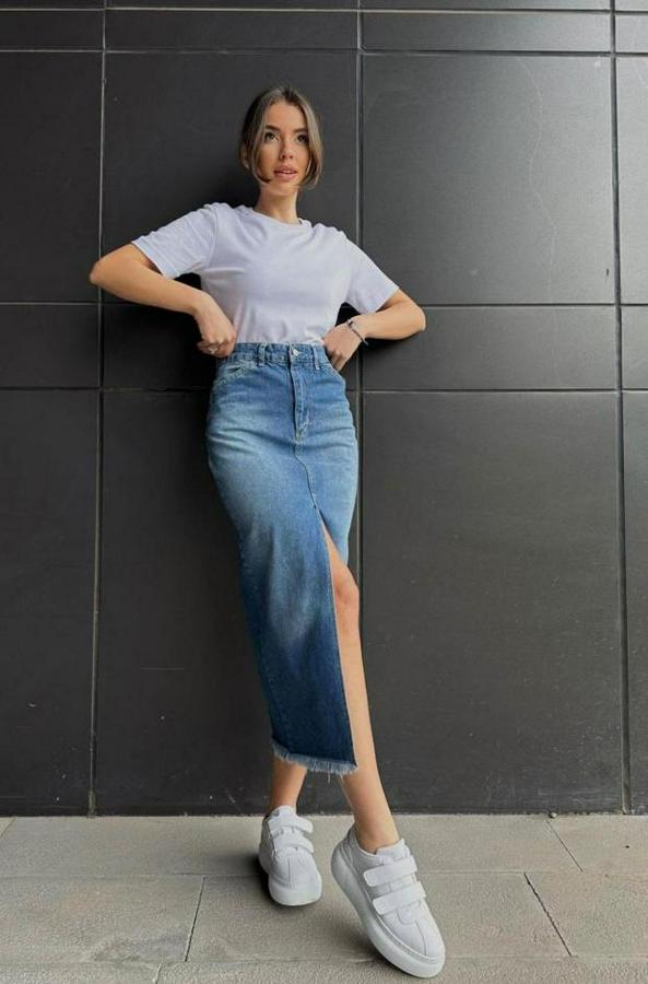 Mavi Yırtmaçlı Kot Etek