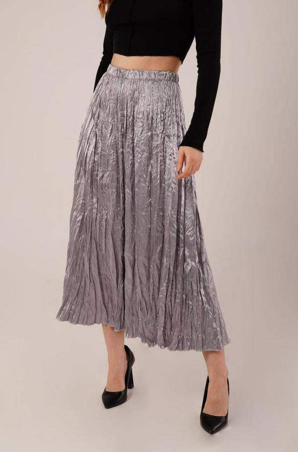 AnasayfaTüm ÜrünlerÜst GiyimBluz & TunikBluzMidi Boy Pileli Saten Gri Etek