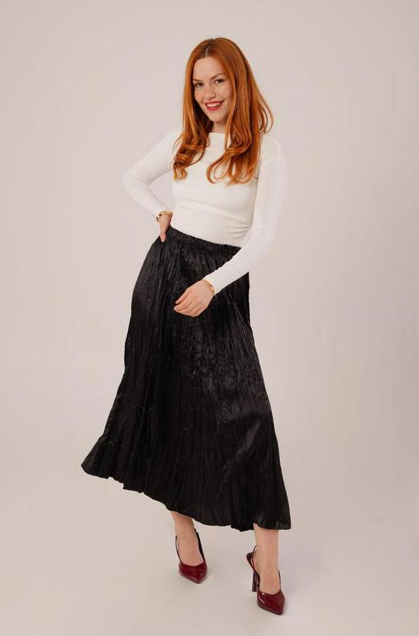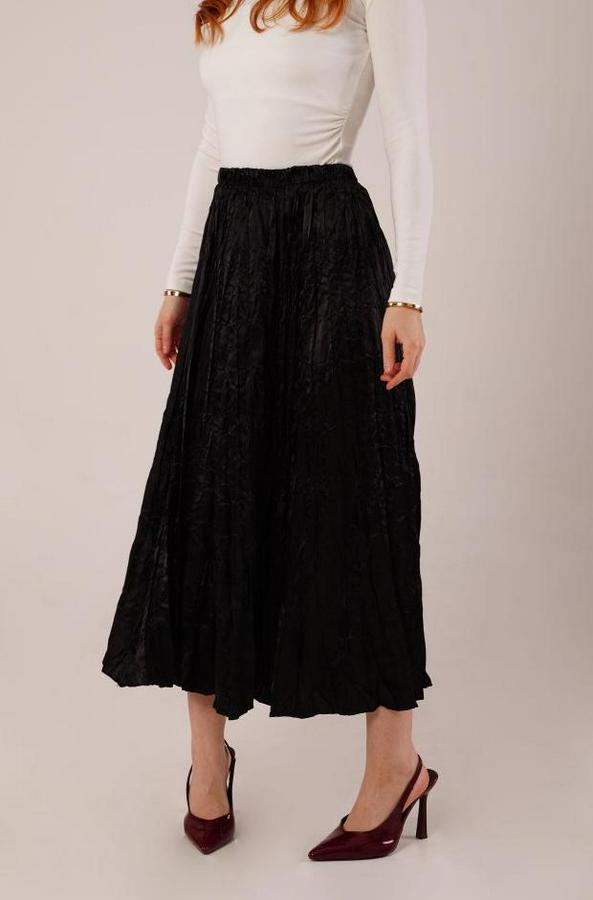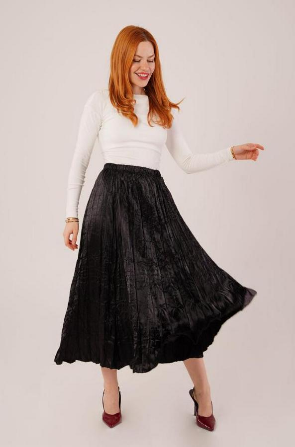Midi Boy Pileli Saten Siyah Etek