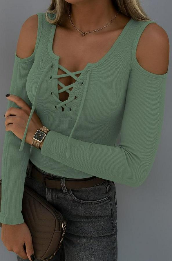Kadın Omuzlardan Açık Uzun Kollu Bağcıklı Kaşkorse Bluz