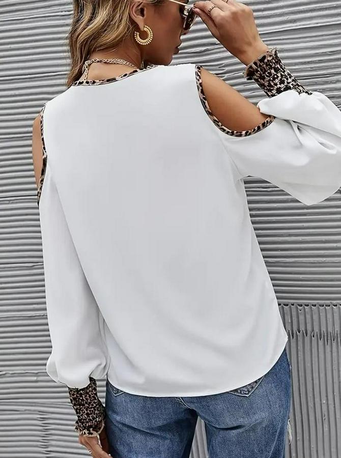 Kadın Omuzlardan Açık Yakalı önden Düğmeli Leopar Detaylı Sandy Bluz