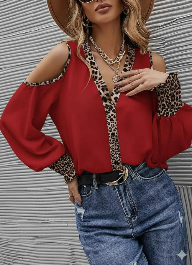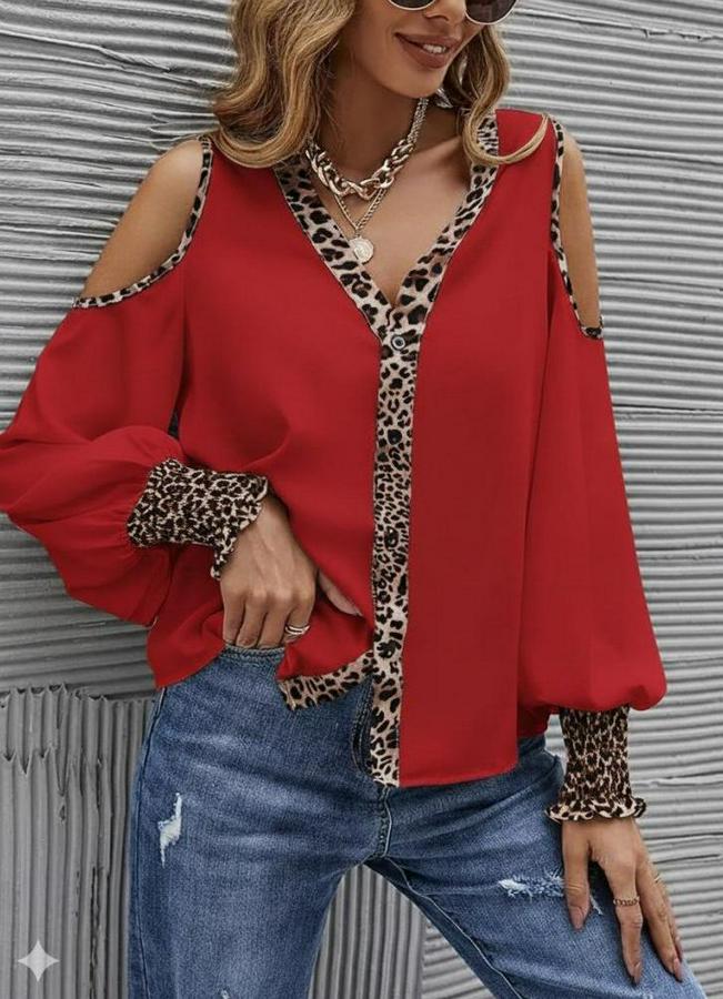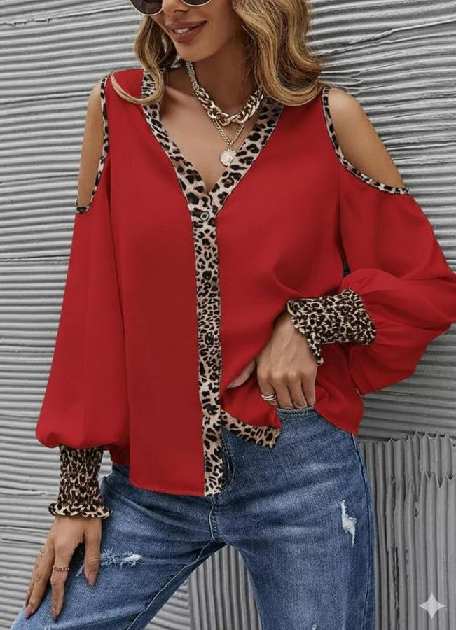 Kadın Omuzlardan Açık Yakalı önden Düğmeli Leopar Detaylı Sandy Bluz
