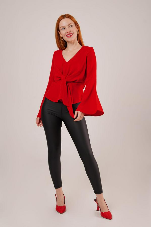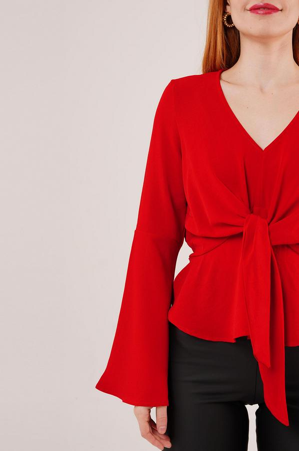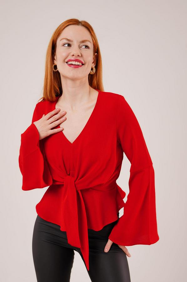 Ön Bağlamalı Volan Kol Kırmızı Bluz