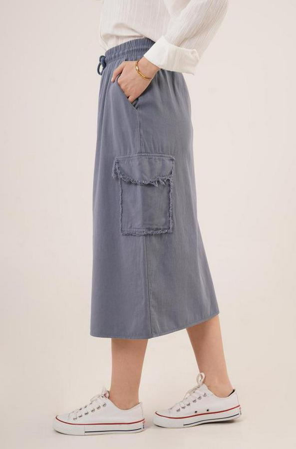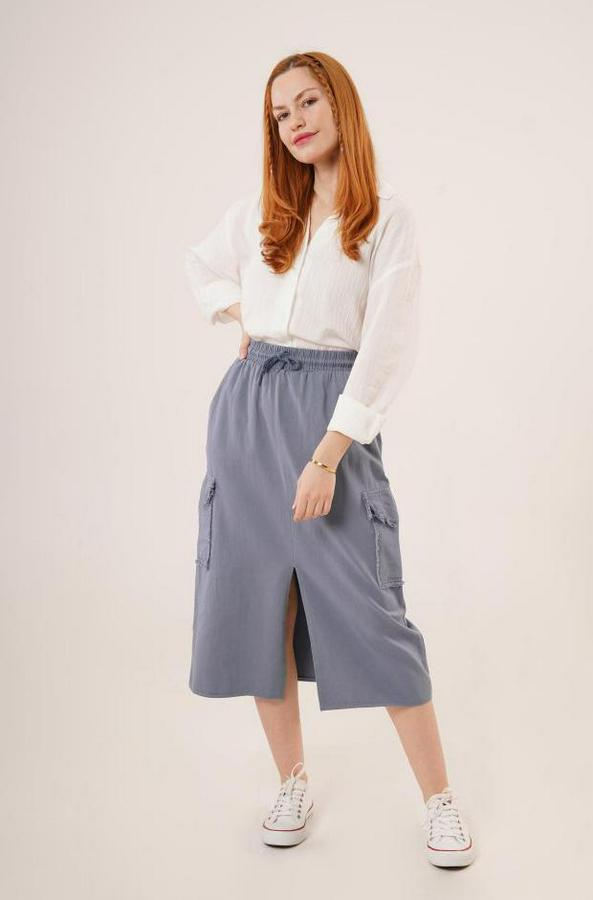 Ön Yırtmaçlı Cep Detaylı Indigo Etek