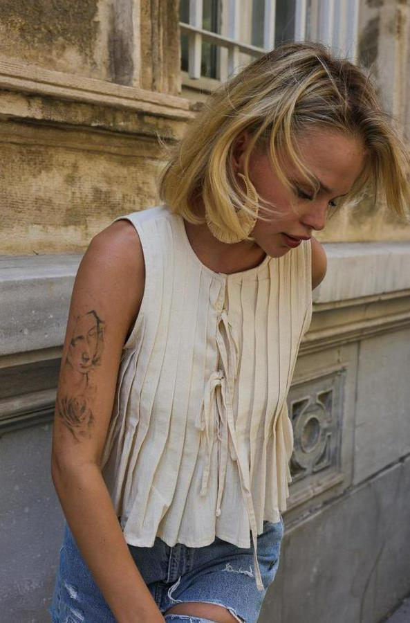 Pileli Bağlamlı Bluz - Natür
