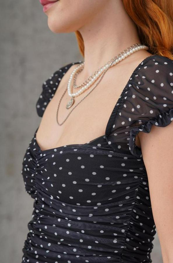 AnasayfaTüm ÜrünlerÜst GiyimBluz & TunikBluzPuantiyeli Belden Oturtmalı Tül Siyah Bluz