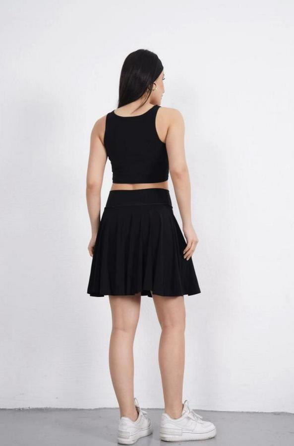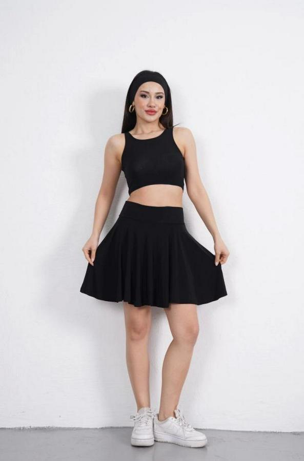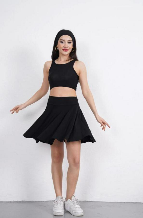 Sendy Kumaş Bisiklet Yaka Crop Şortlu Etek Ikili Takım - Siyah