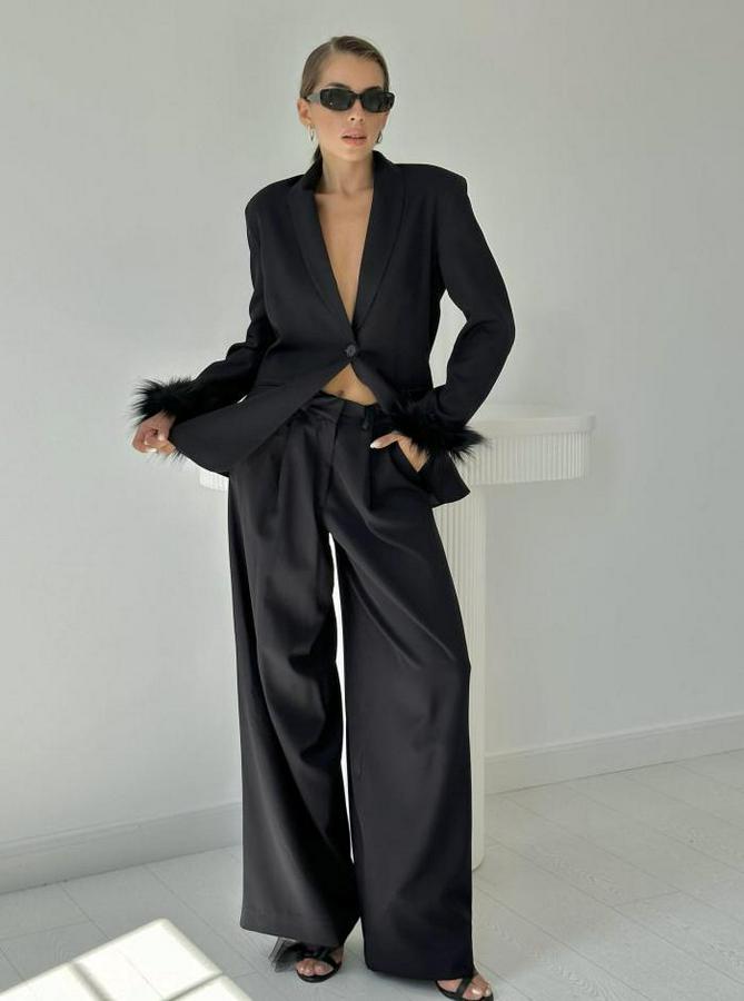 Siyah Kol Ucu Tüylü Ceket & Pantolon Takım