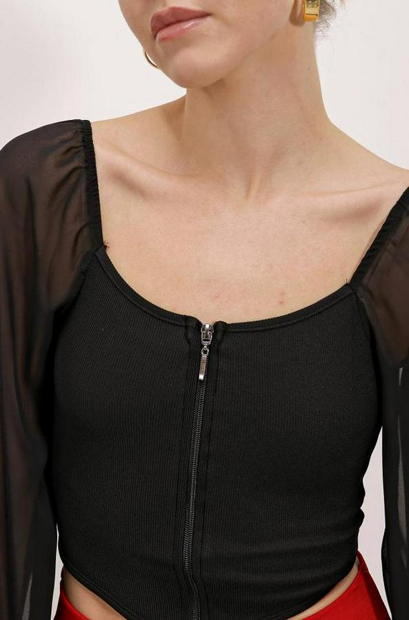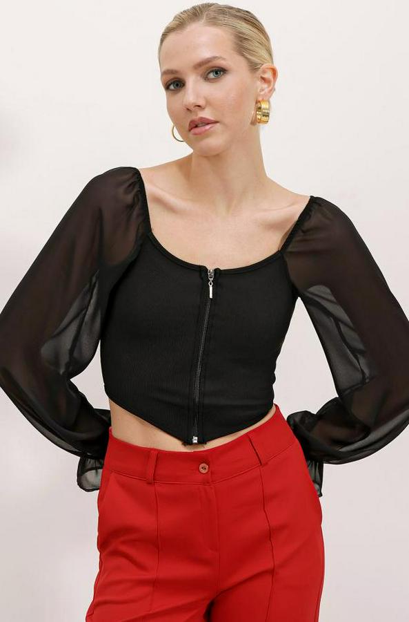 Siyah Şifon Önü Fermuarlı Bluz 0496