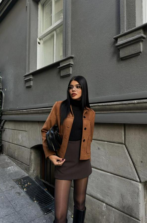SÜET CROP CEKET CEP DETAYLI - Taba