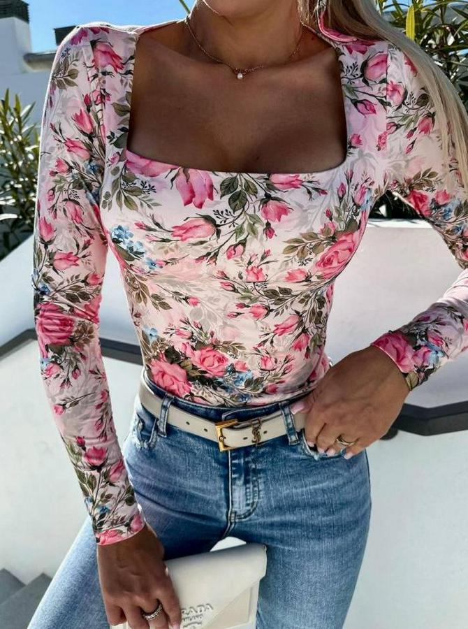 Süprem Kumaş Çiçek Desen Uzun Kollu Kare Yaka Bluz