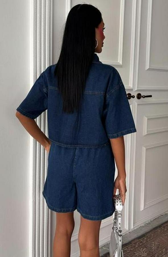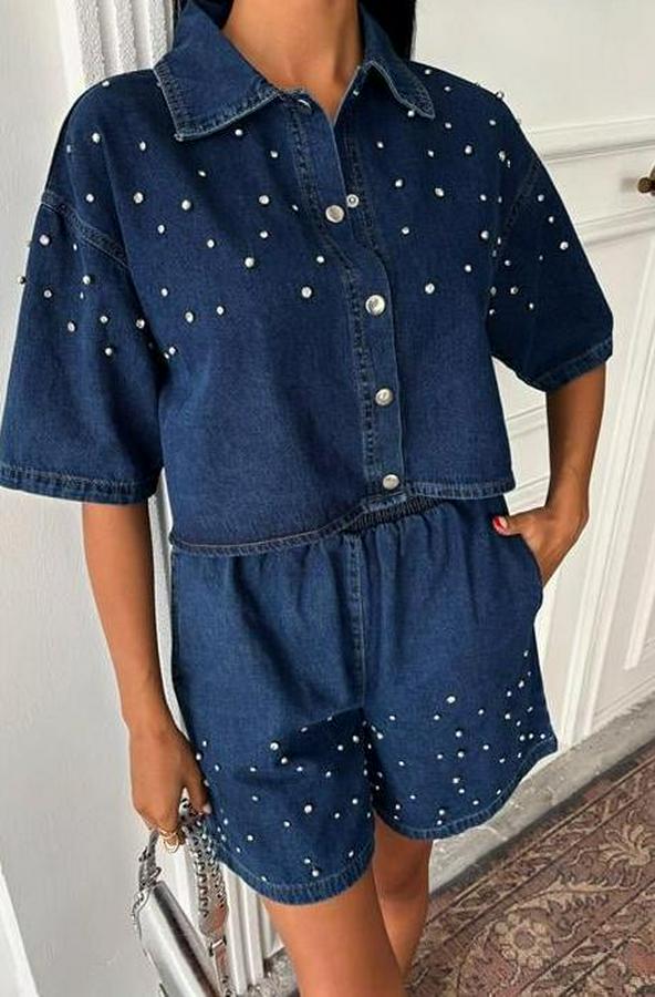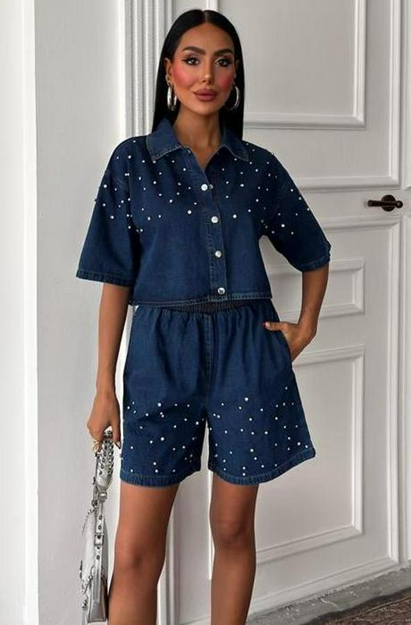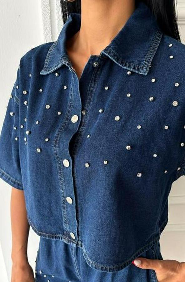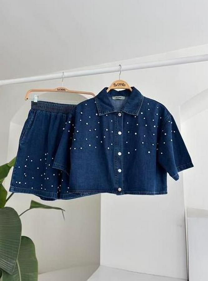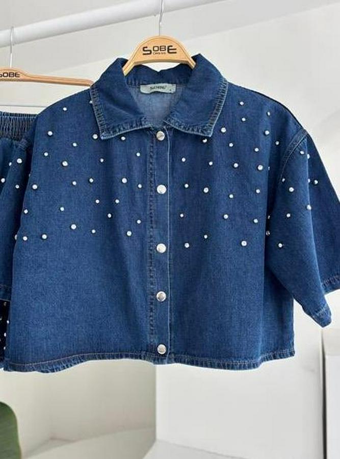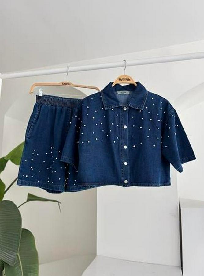 Taş Detaylı Gömlek Şort Denim Takım 10175