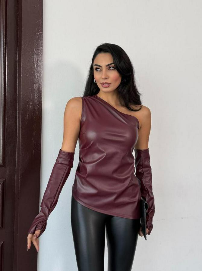 Tek Omuz Eldiven Detay Deri Bluz