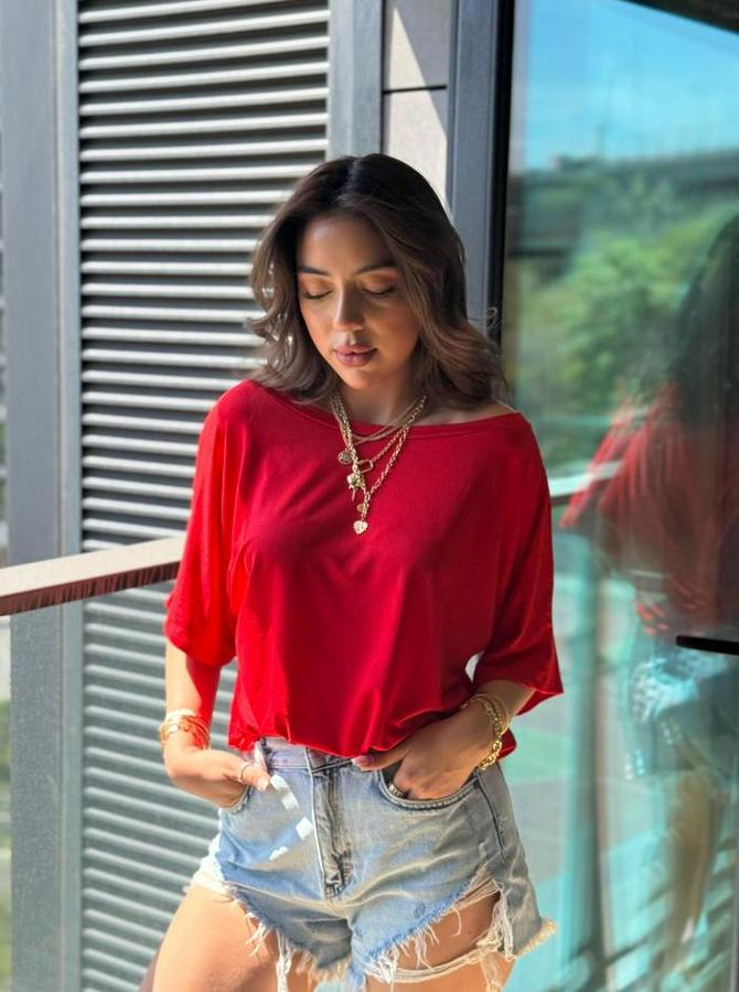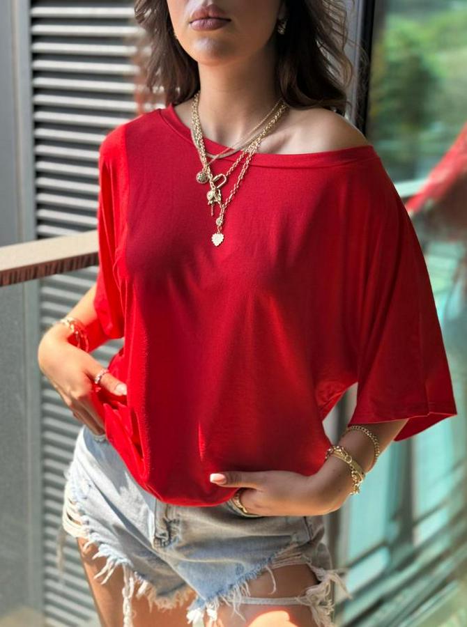 AnasayfaTüm ÜrünlerÜst GiyimBluz & TunikBluzTek Omuzu Açık Kısa Kollu Salaş Viskon Bluz