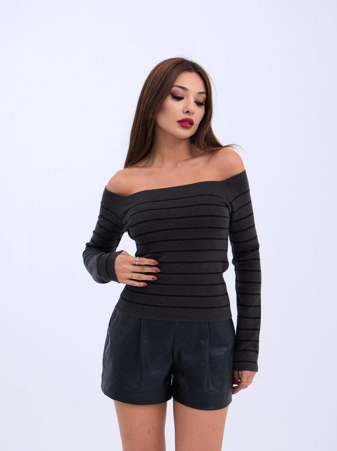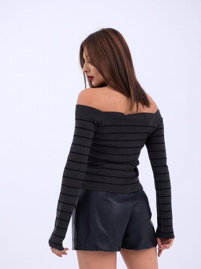 4206 TRİKO ÇİZGİLİ KAYIK YAKA CROP-ANTRASİT-SİYAH