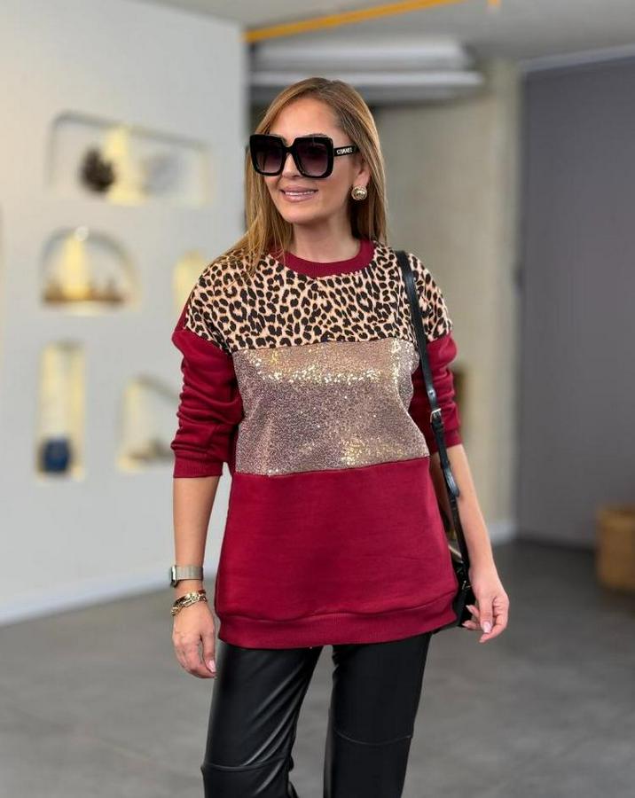 AnasayfaTüm ÜrünlerÜst GiyimBluz & TunikBluzÜç Iplik Şardonlu Kumaş Leopar Desenli Bluz