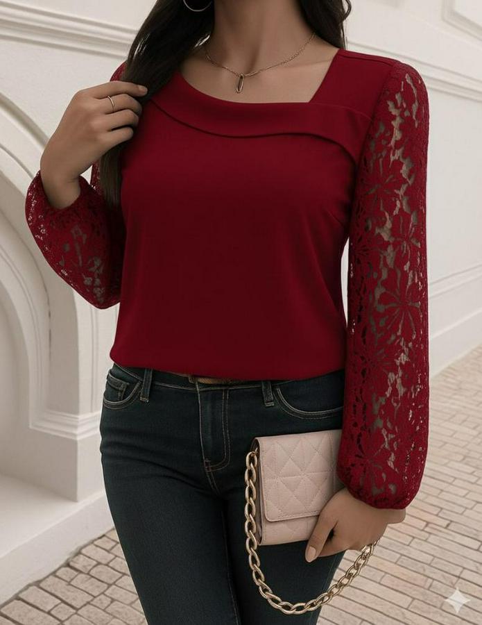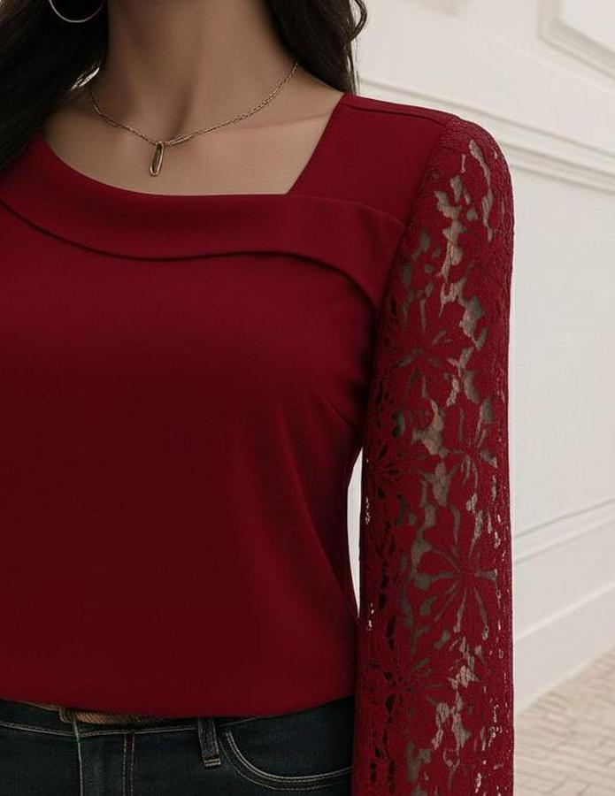 Uzun Kollu Asimetrik Yakalı Dantelli Ithal Krep Bluz