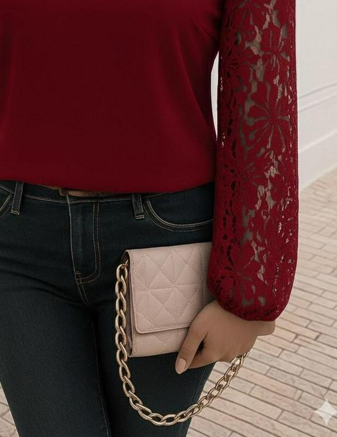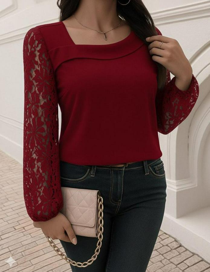 AnasayfaTüm ÜrünlerÜst GiyimBluz & TunikBluzUzun Kollu Asimetrik Yakalı Dantelli Ithal Krep Bluz