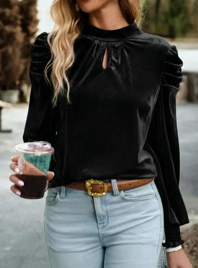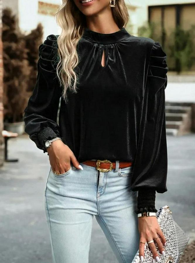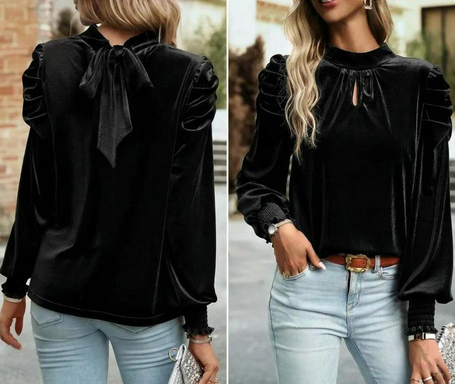 Uzun Kollu Balıkçı Yaka Damla Detaylı Kadife Bluz