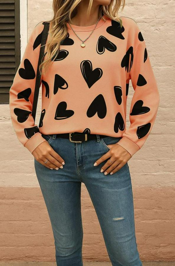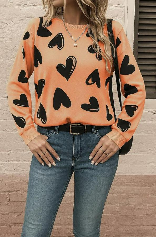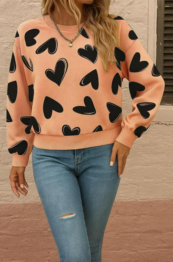 AnasayfaTüm ÜrünlerÜst GiyimBluz & TunikBluzUzun Kollu Bisiklet Yaka Kalp Desenli Iki Iplik Bluz