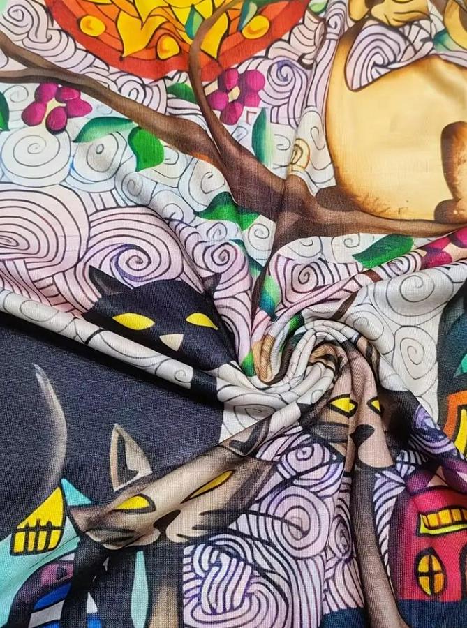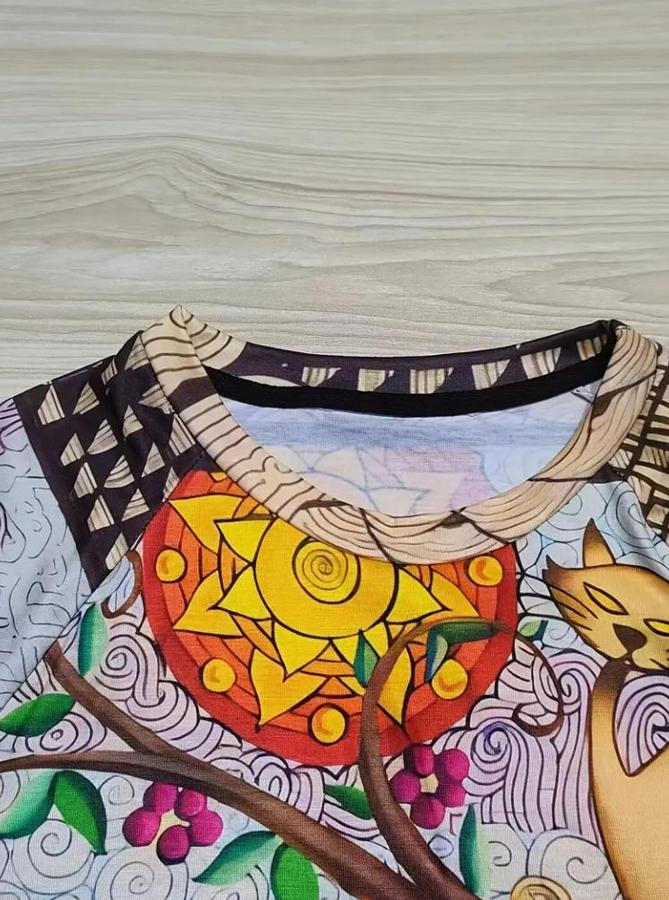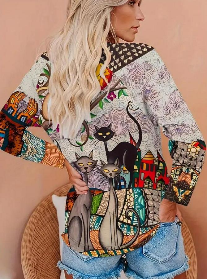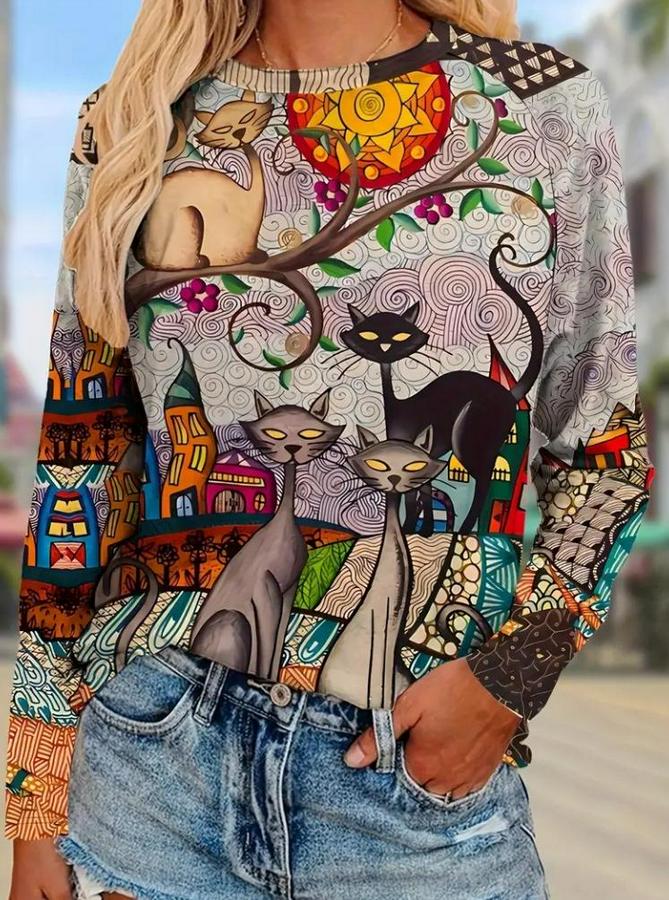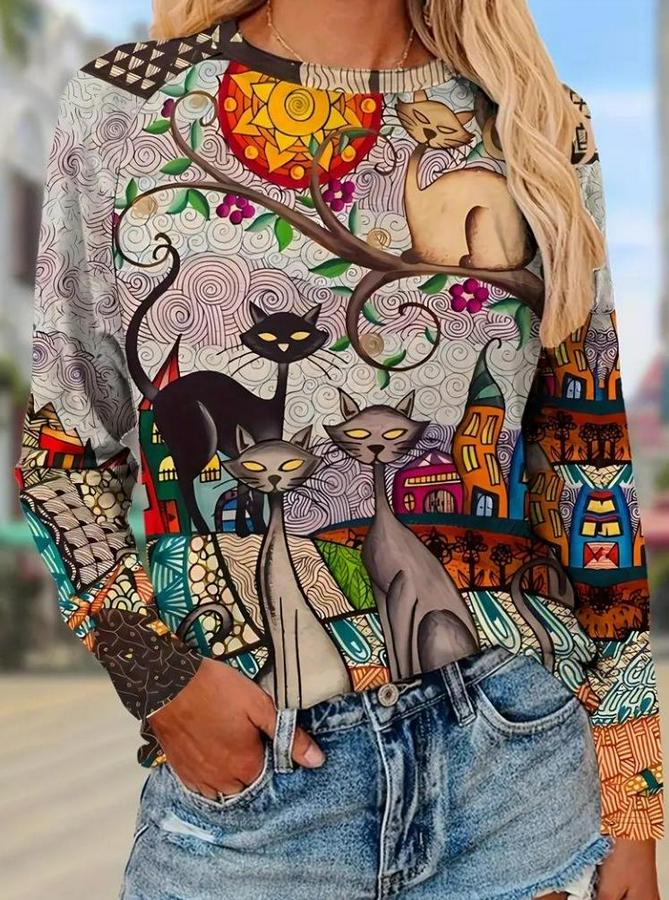 Uzun Kollu Bisiklet Yaka Kedi Baskılı Süprem Bluz