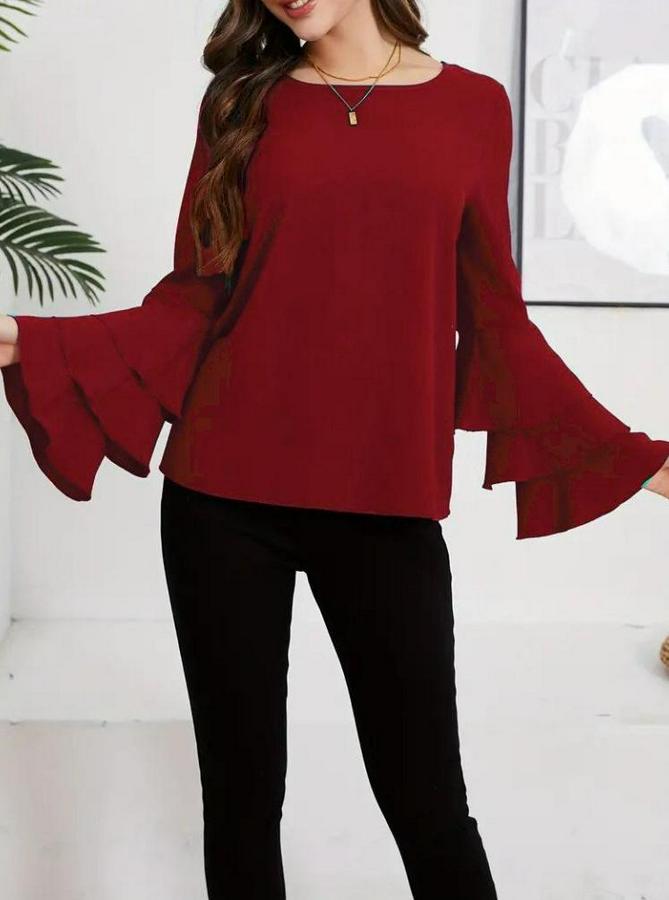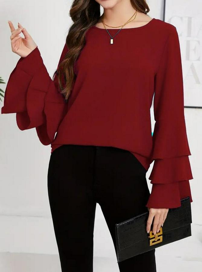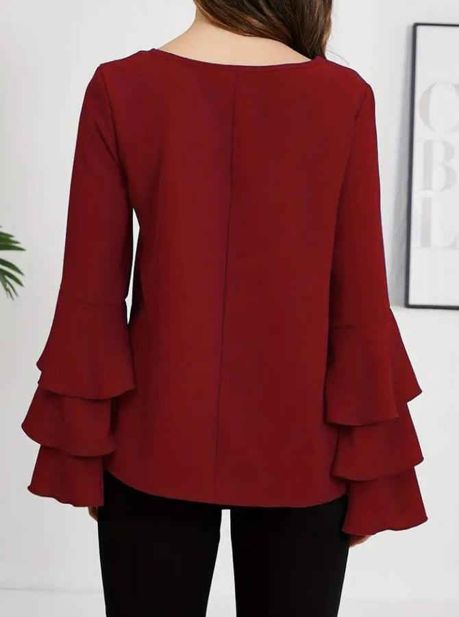 Uzun Kollu Bisiklet Yaka Kollar Ispanyol Volanlı Sandy Bluz