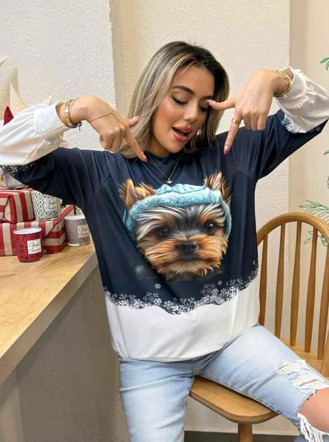 AnasayfaTüm ÜrünlerÜst GiyimBluz & TunikBluzUzun Kollu Bisiklet Yaka Köpek Baskılı Şardonlu Dalgıç Bluz