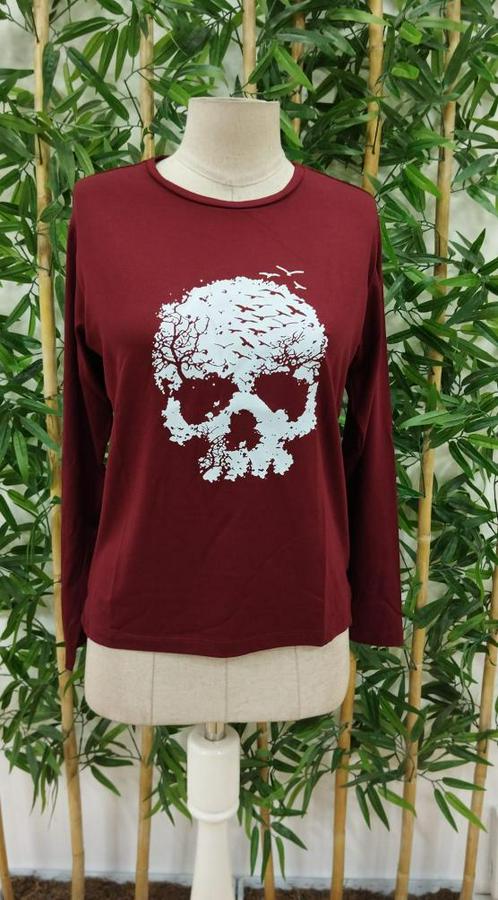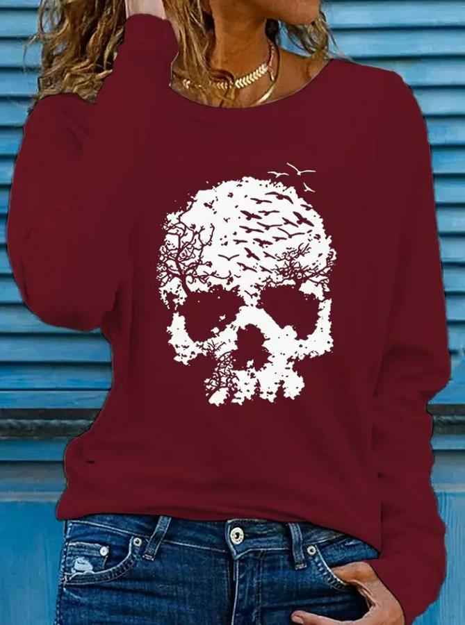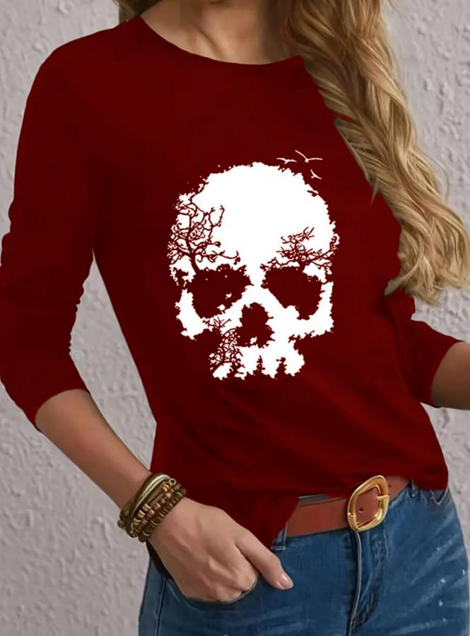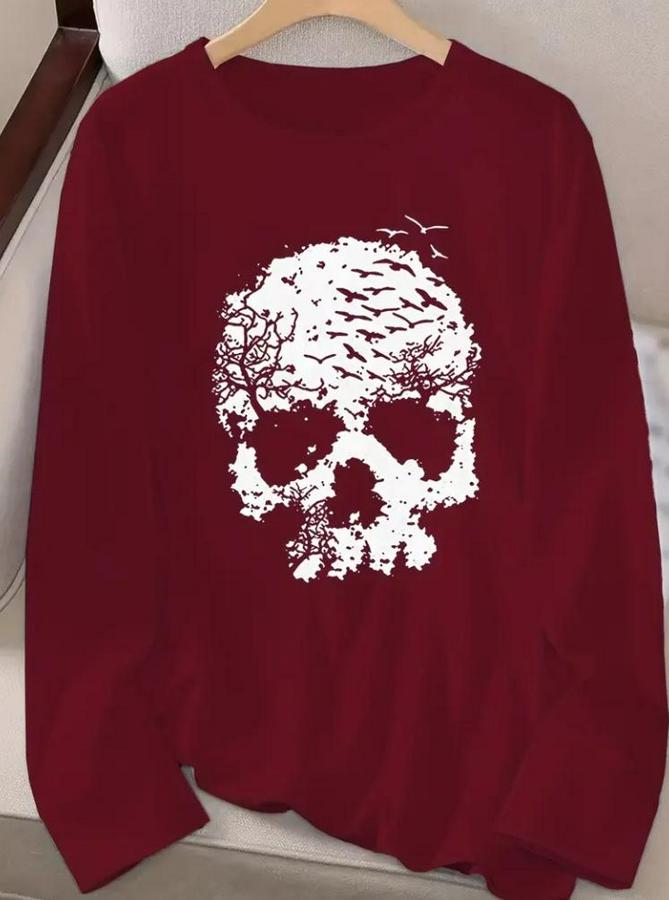 AnasayfaTüm ÜrünlerÜst GiyimBluz & TunikBluzUzun Kollu Bisiklet Yaka Kurukafa Desenli Viskon Bluz