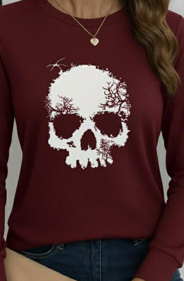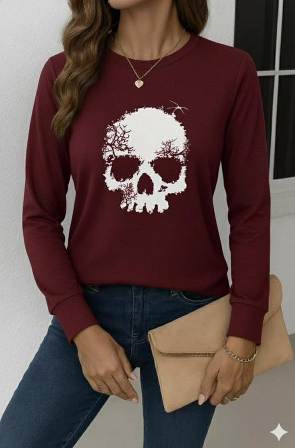AnasayfaTüm ÜrünlerÜst GiyimBluz & TunikBluzUzun Kollu Bisiklet Yaka Kurukafa Desenli Viskon Bluz