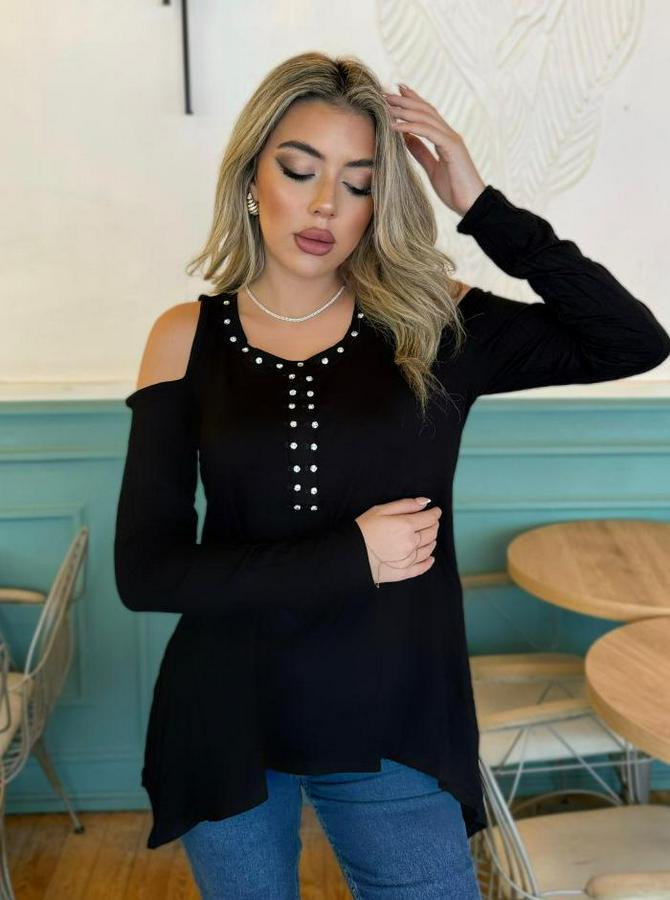AnasayfaTüm ÜrünlerÜst GiyimBluz & TunikBluzUzun Kollu Bisiklet Yaka Önü Taşlı Omuzu Açık Etek Ucu Asimetrik Kesim Viskon Bluz