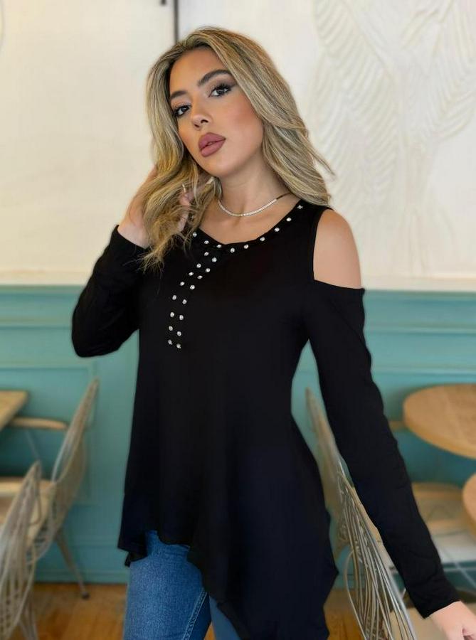 Kadın Uzun Kollu Bisiklet Yaka önü Taşlı Omuzu Açık Etek Ucu Asimetrik Kesim Viskon Bluz