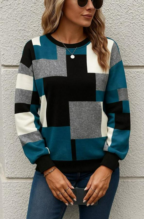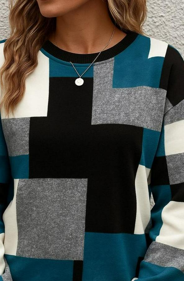 AnasayfaTüm ÜrünlerÜst GiyimBluz & TunikBluzUzun Kollu Bisiklet Yaka Renkli Blok Baskı Dalgıç Bluz