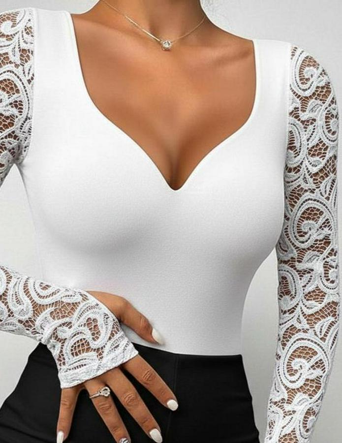 AnasayfaTüm ÜrünlerÜst GiyimBluz & TunikBluzUzun Kollu Dantelli Dekolte Detaylı Dalgıç Bluz