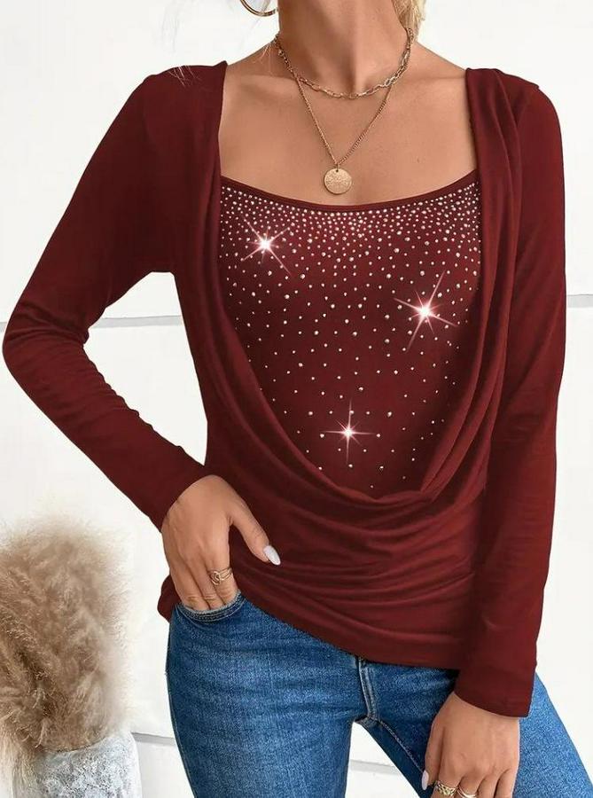 Kadın Uzun Kollu Derin Degaje Yakalı Taşlı Sandy Bluz