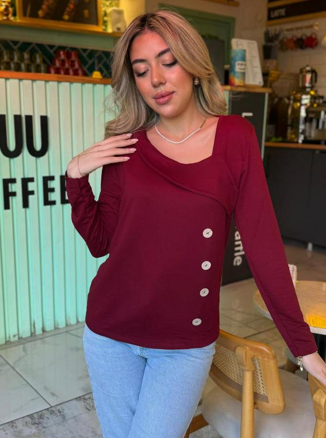 Uzun Kollu Geometrik Yaka Detay Yandan Düğmeli Viskon Iki Iplik Bluz