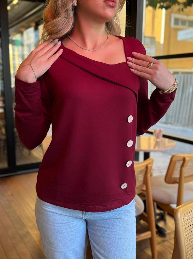 Kadın Uzun Kollu Geometrik Yaka Detay Yandan Düğmeli Viskon Iki Iplik Bluz