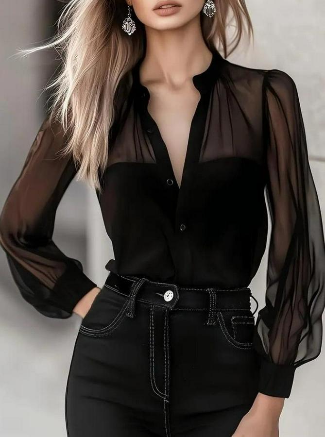 Uzun Kollu Hakim Yakalı Önden Düğmeli Tül Detaylı Trikoton Gömlek