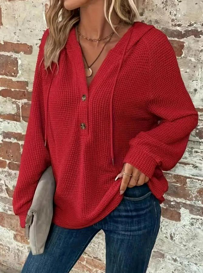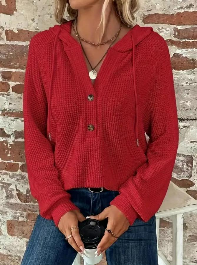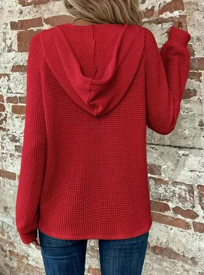 Uzun Kollu Kapşonlu Önü Düğmeli Ve Bağcıklı Waffle Bluz