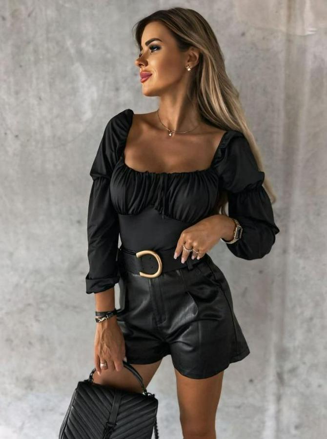 Uzun Kollu Kare Yaka Göğüs Büzgü Detay Sandy Bluz