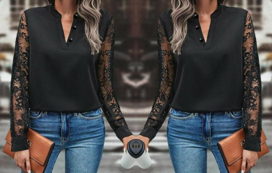 AnasayfaTüm ÜrünlerÜst GiyimBluz & TunikBluzUzun Kollu Kolları Dantelli Hakim Yaka Krep Bluz