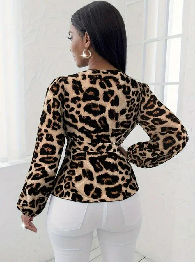 Uzun Kollu Kruvaze Yakalı Belden Kuşaklı Leopar Desenli Süprem Bluz