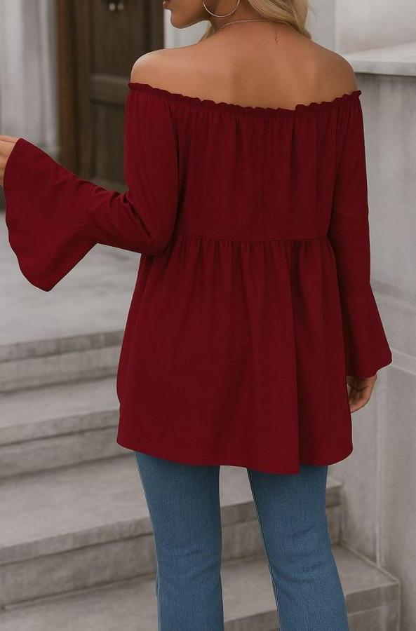 AnasayfaTüm ÜrünlerÜst GiyimBluz & TunikBluzUzun Kollu Madonna Yaka Asimetrik Detaylı Kolları Ispanyol Viskon Bluz