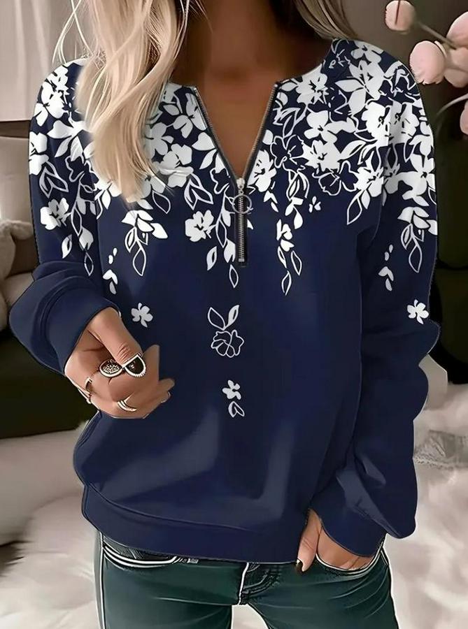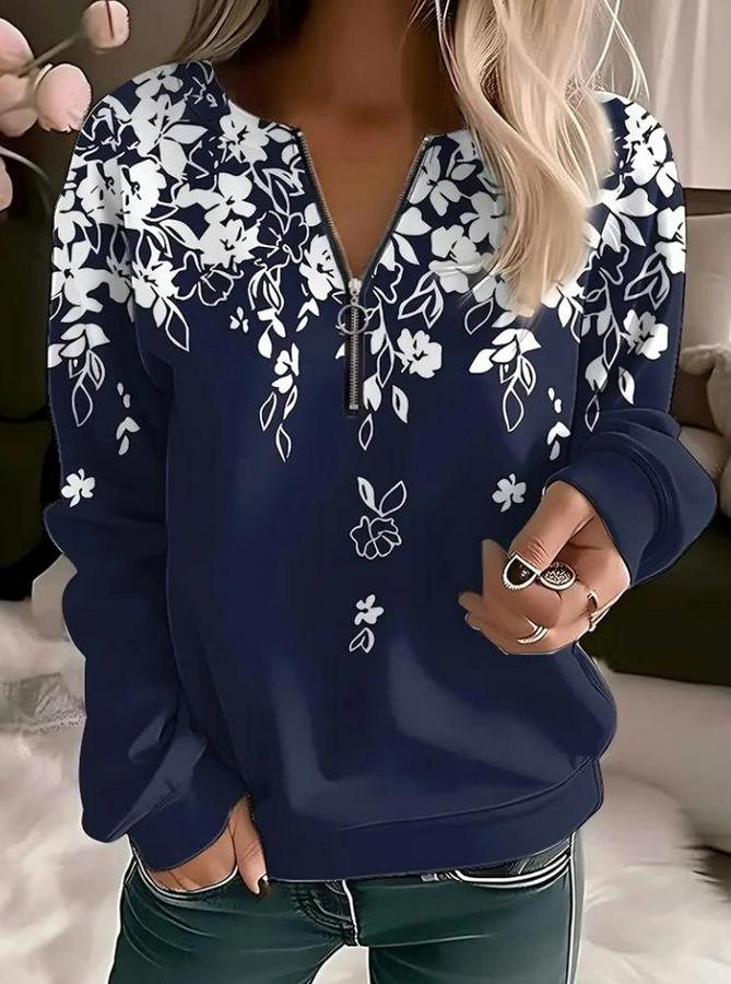 Kadın Uzun Kollu önden Fermuarlı çiçek Desenli şardonlu Dalgıç Bluz